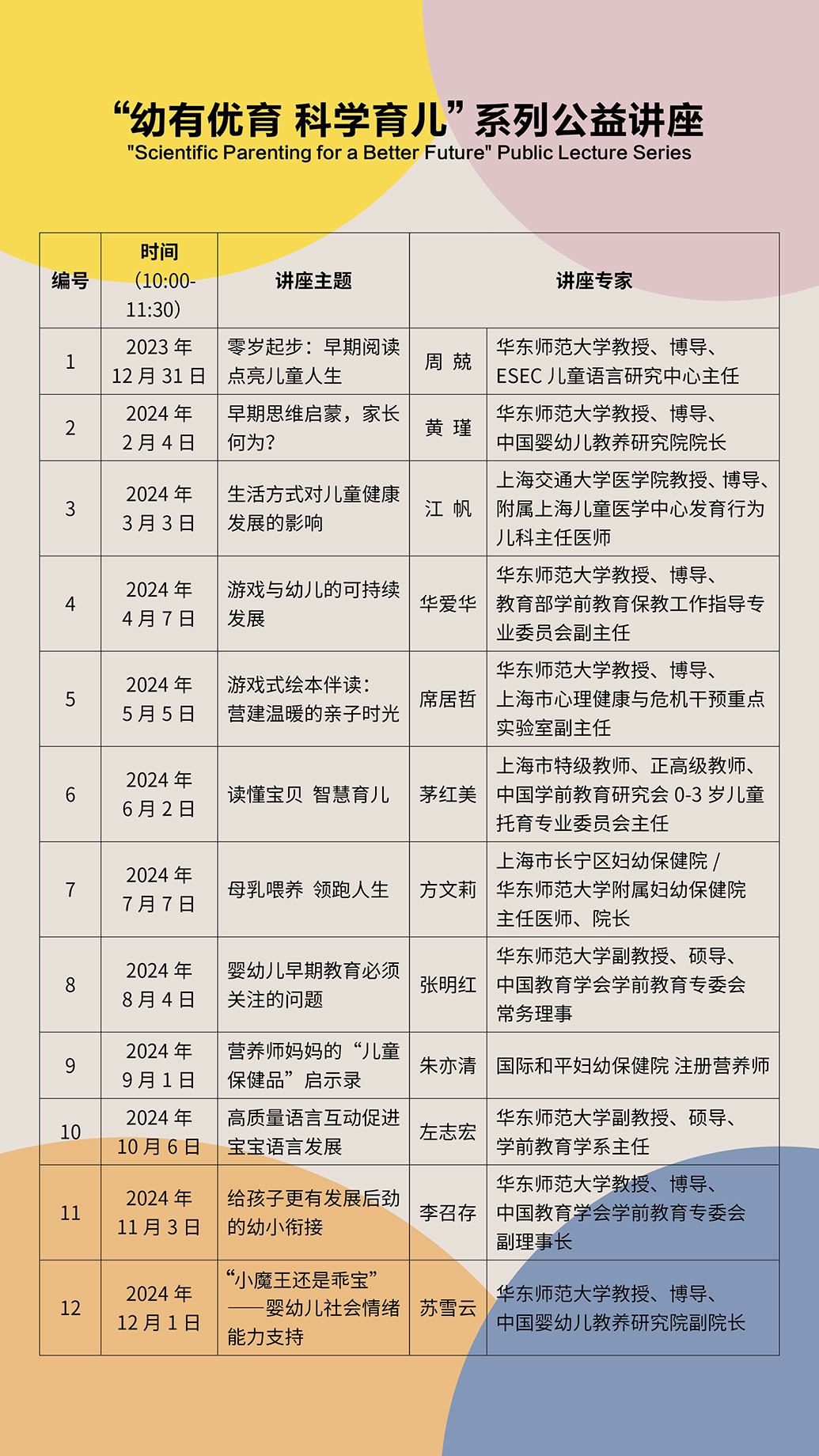 永利皇宫登录官网今年新成立了中国婴幼儿教养研究院,并组织策划推出了这12场公益讲座,专注于0-6岁儿童早期发展研究、科学教养指导和专业咨询服务,汇聚教育学、医学、发展心理学、营养学等多个专业领域的国内知名学者,共同为“最柔软群体”的健康成长支招。