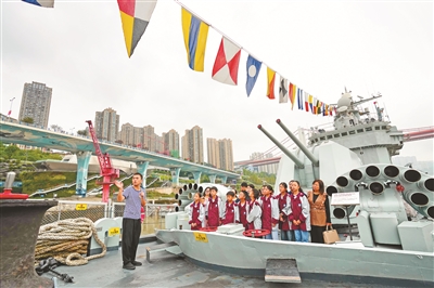 图为近日,在重庆建川海疆博物馆展出的我国海军退役军舰上,城口县蓼子乡第一中心小学的学生、教师代表在体验铁路小学爱国主义教育主题课校外活动。新华社记者 刘潺 摄