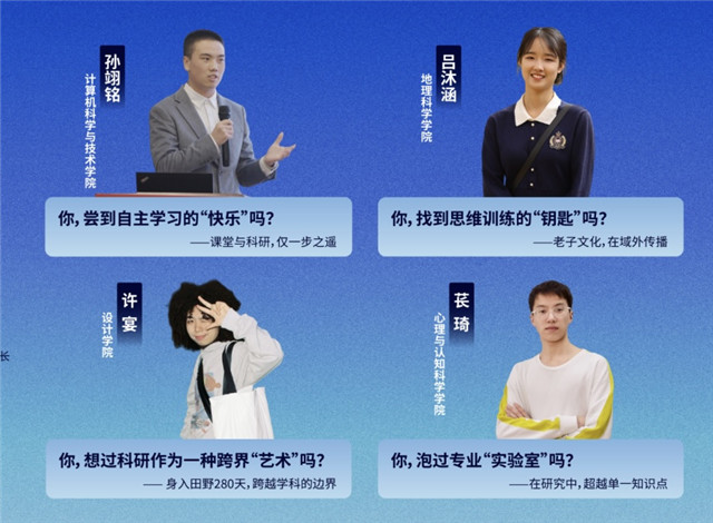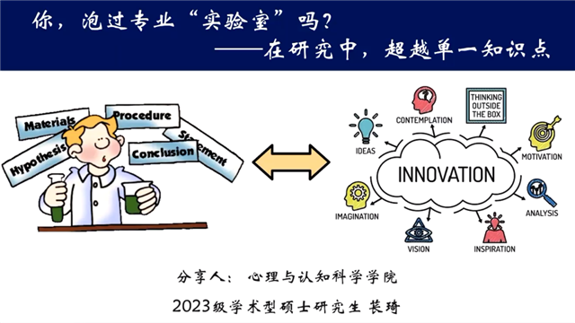 地理科学学院2022级研究生吕沐涵同学分享了如何在老子文化的研究中找到思维训练的“钥匙”。她提出思维训练的三把钥匙:一是在本科低年级段即可尝试参加合作性学习;二是参与合作性学习工作时一定要带着目标出发;三是要多与“巨人”对话,站在巨人肩上学习研究。设计学院2021级研究生许宴同学和心理与认知科学学院2023级研究生苌琦同学,分别探讨科研和艺术的跨界联系,以及在研究中超越单一知识点的重要性。