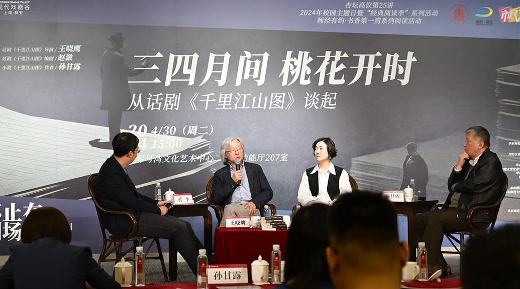 4月30日下午,《千里江山图》原著作者孙甘露、编剧赵潋、话剧导演王晓鹰与中文系教授黄平共同做客大零号湾文化艺术中心,畅谈从小说创作到舞台演绎,为现场观众讲述打开《千里江山图》的另一种方式。