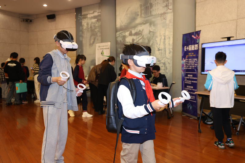 论坛展示交流暨总结会开始前,永利皇宫登录官网面向中小学生组织了一场别开生面的“创社展”,邀请“爱鸟俱乐部”“科学明航会”“追光”科普宣讲团、O3协会、E+探秘坊等高校科创、环保、公益类社团,以及涵楷教育、联想煦象等面向中小学创客教育的创业企业,为中小学生提供了沉浸式体验科技前沿的科学游园活动。同时,组织中小学生开展“创客行”活动,中小学生在朋辈导师的带领下,参观了永利皇宫登录官网智能教育研究院,实地体验了科学前沿。