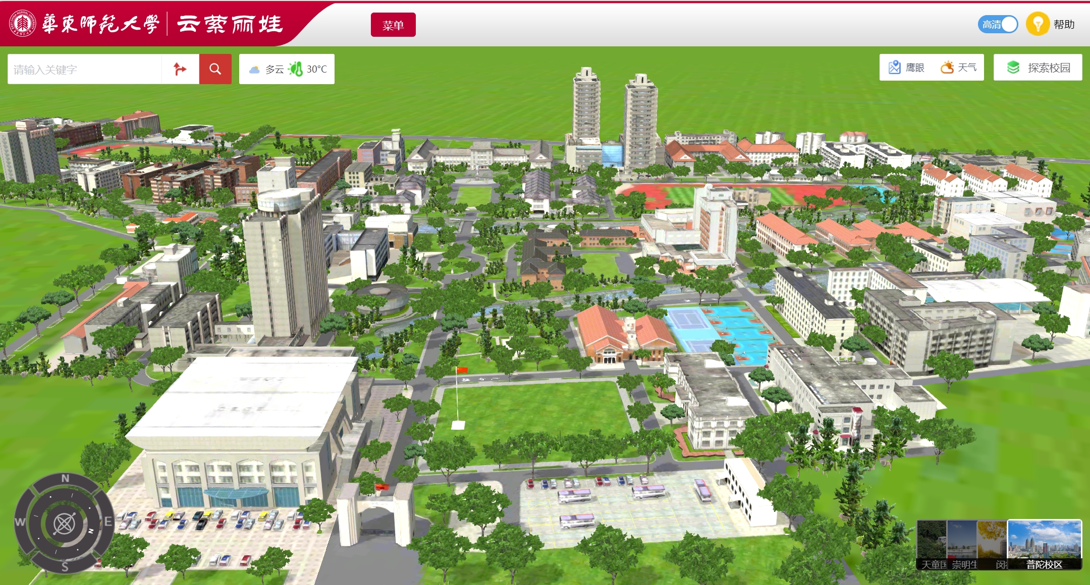 今年,华东师大推出“云萦丽娃”数字孪生校园。这个数字孪生校园由学校信息化治理办公室历时4年倾力打造,1:1复刻普陀校区、闵行校区云端数字校园,同时将学校位于上海市崇明区的崇明生态研究院、浙江省宁波市的浙江天童森林生态系统国家野外科学观测研究站也进行云上复刻,打造高水平的线上文化载体。之所以起名“云萦丽娃”,是因为“云”既有依托大数据,云计算之意,并且能实时体现校园内真实的天气情况,此外,还寄托了信息办工程师们对校园的热爱。