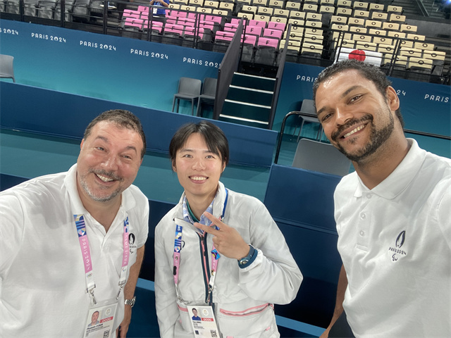 留着干练短发的梁艳小时候就是打篮球出身,后来考入南京师范大学篮球专项,之后又在华东师大读硕博。原本的巴黎奥运会,梁艳就拿到了志愿者Offer,但因与学业有一定冲突,她只能割爱。幸运的是,她继续拿到了残奥会志愿者的入场券。从比赛正式开幕日前两天参与场地测试到9月7日该项目落幕,作为一名体育研究专业的博士生的她挑起了专业活儿。