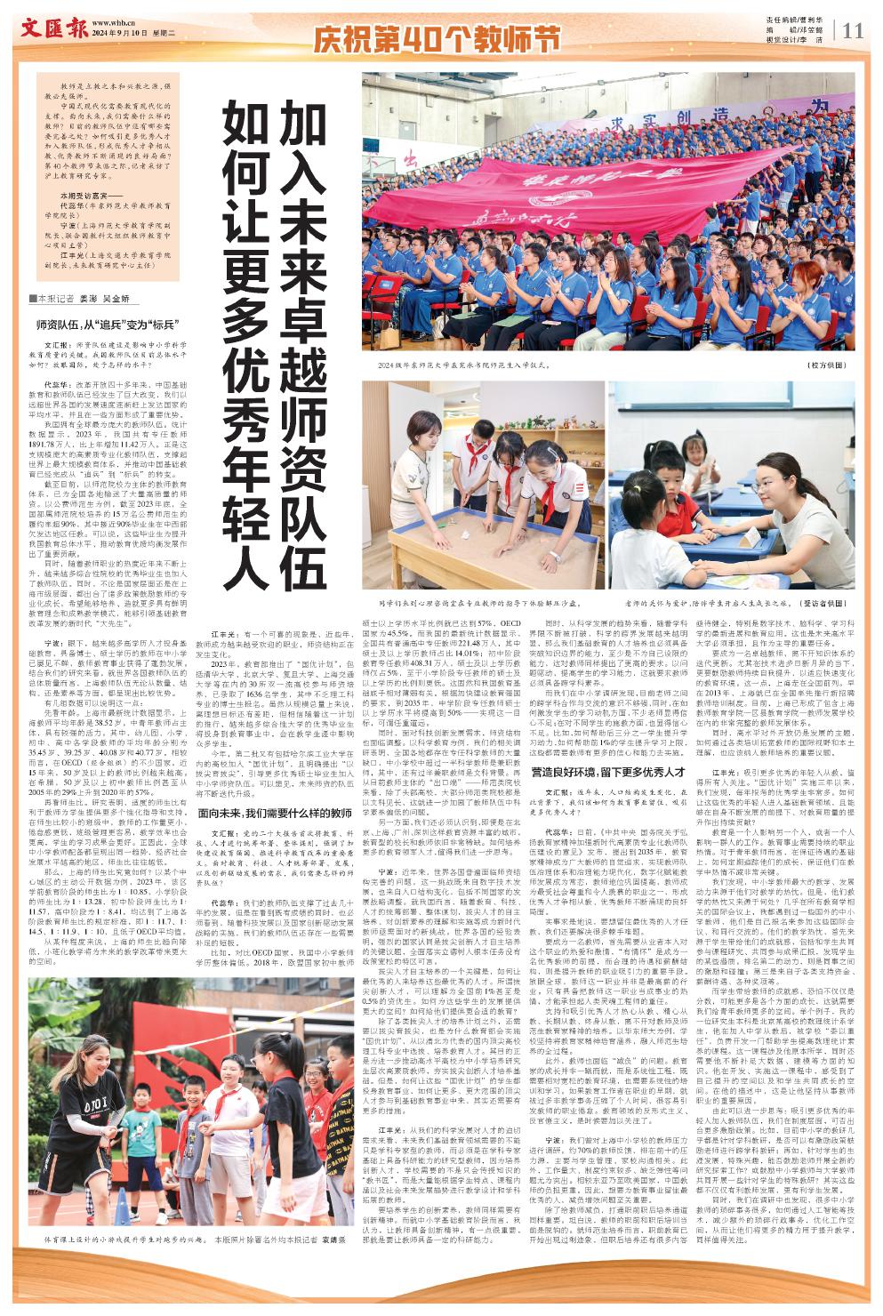中国式现代化需要教育现代化的支撑。面向未来,我们需要什么样的教师?目前的教师队伍中还有哪些需要完善之处?如何吸引更多优秀人才加入教师队伍,形成优秀人才争相从教、优秀教师不断涌现的良好局面?第40个教师节来临之际,记者采访了沪上教育研究专家。