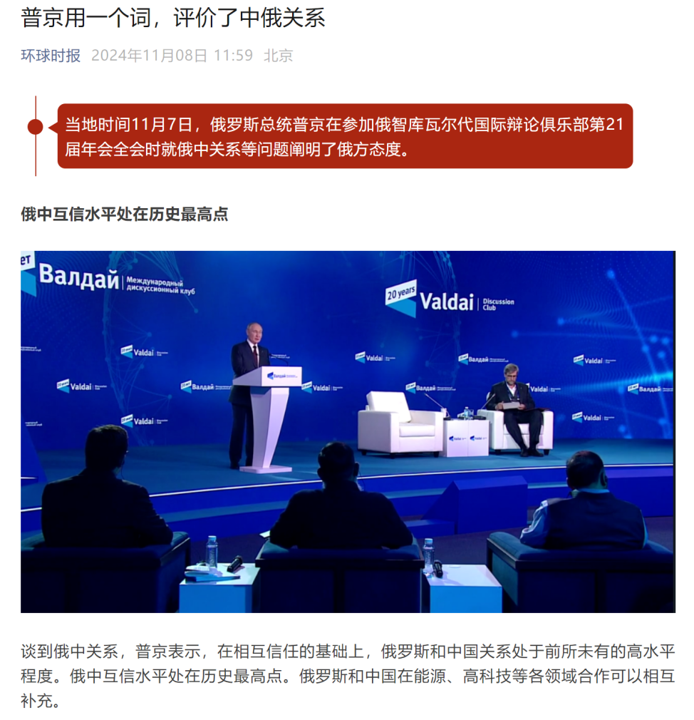 今日俄罗斯RT官方微博的视频报道 | 普京:俄中之间的信任程度达到近代史上的高峰