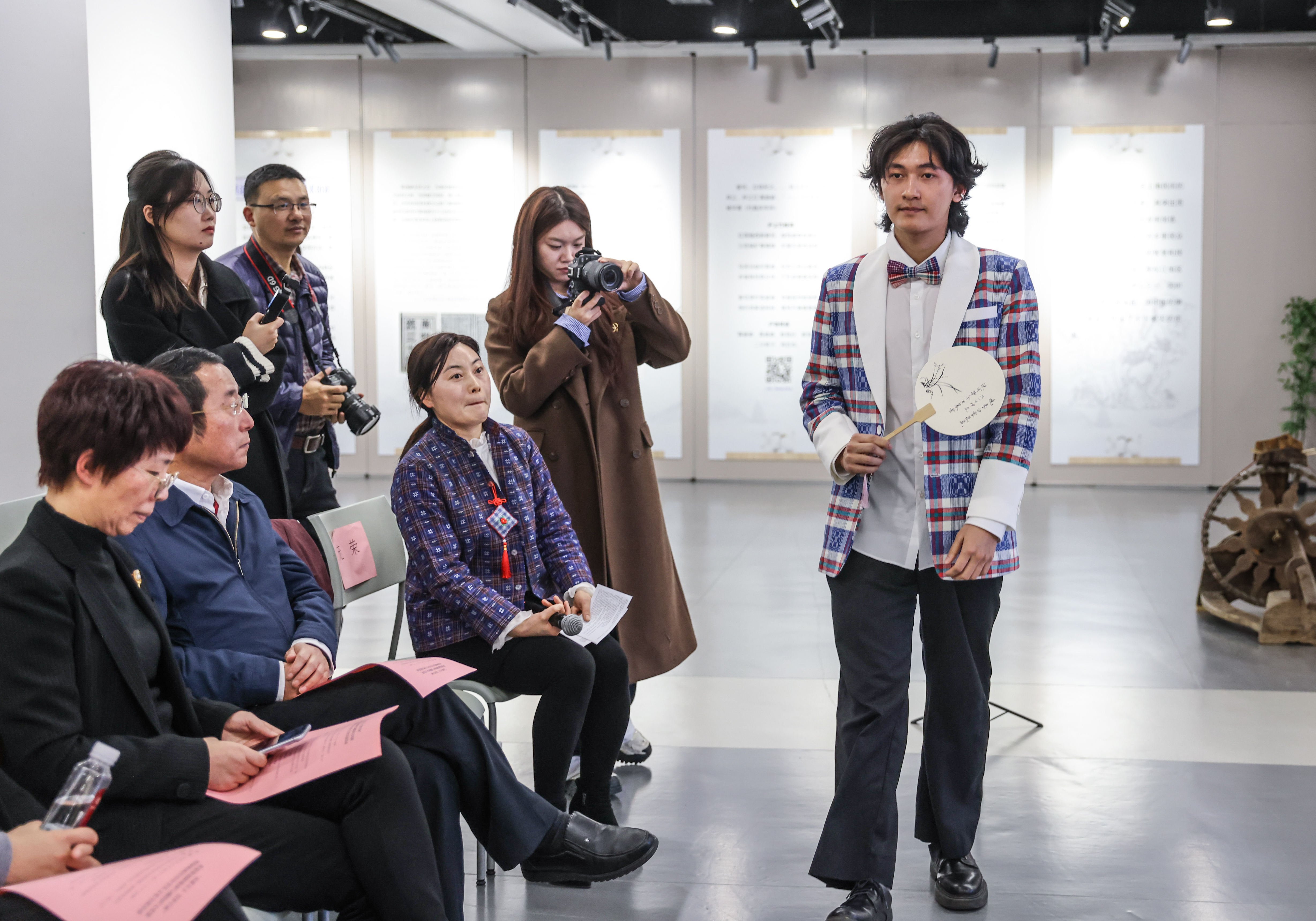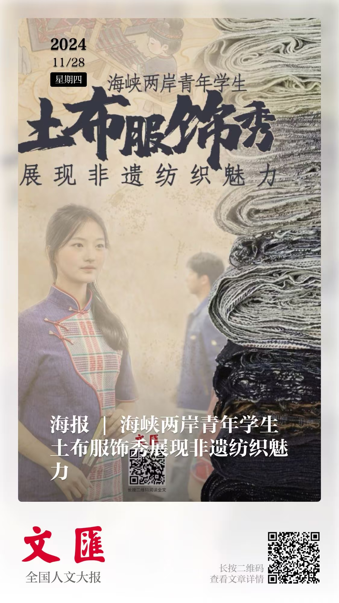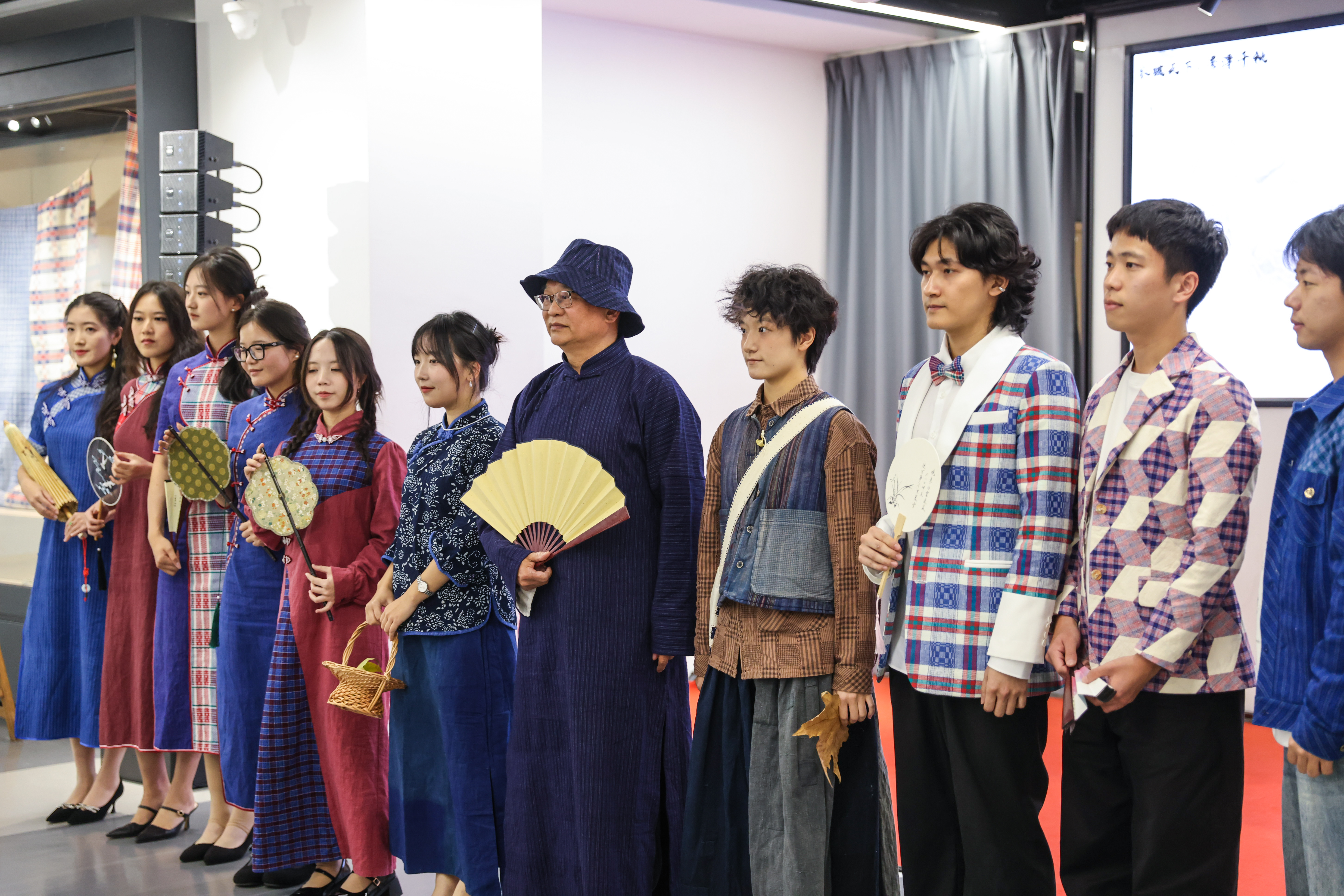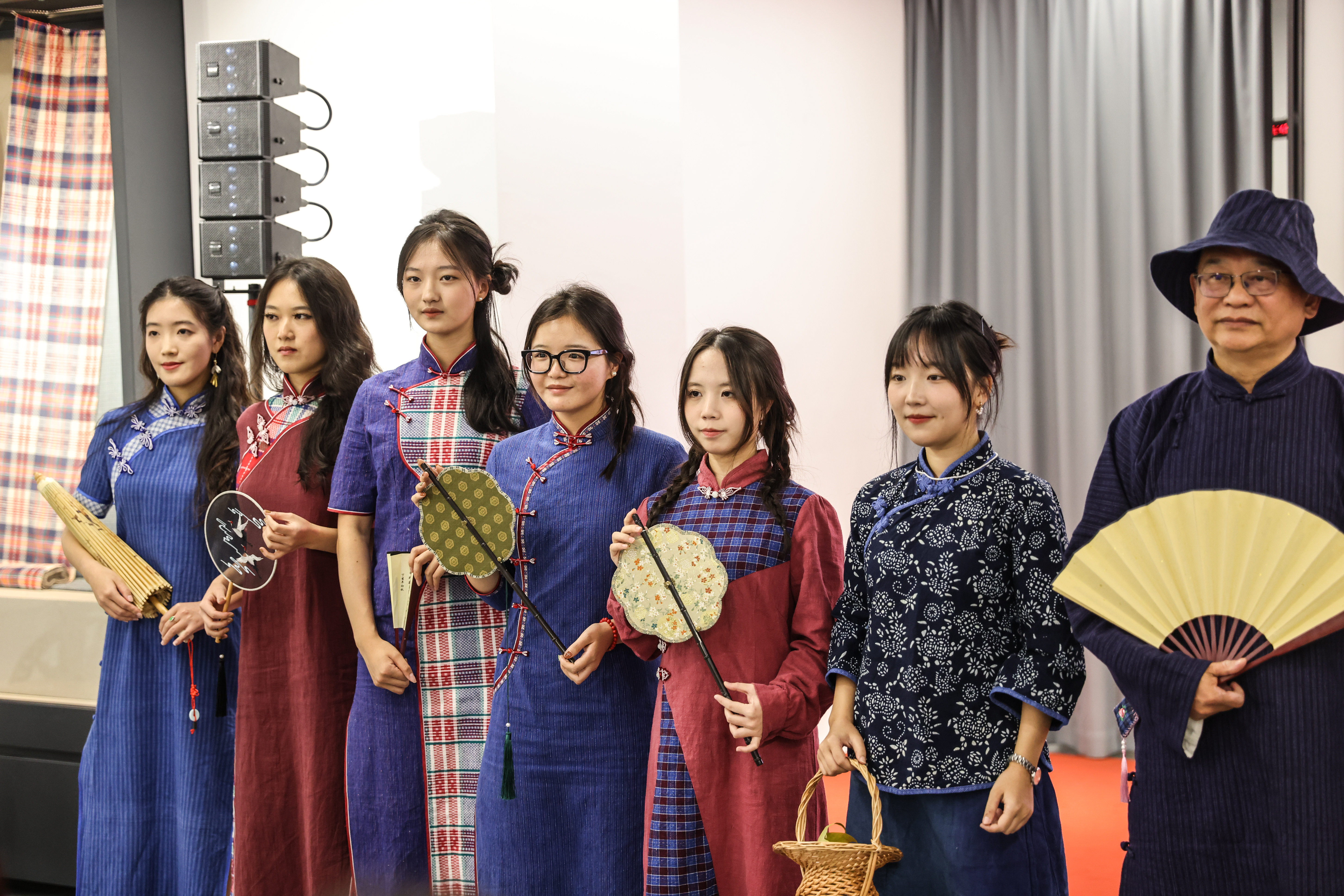 服饰秀环节,海峡两岸青年学生身着手工制作的土布服饰惊艳亮相,展示棉纺织技艺与现代时尚的完美交融。这些服饰的设计独具匠心,有的巧妙融入现代时尚元素,有的则原汁原味保留传统图案和工艺,每一件服饰都仿佛在静静诉说黄道婆精神在当代的传承与创新故事。传承人展示环节中,国家级非遗项目乌泥泾(黄道婆)手工棉纺织技艺徐汇区传承人林秀梅现场向观众进行讲解及操作展示,她熟练地操作三锭纺车,并与青年学生互动,让大家近距离、直观感受传统棉纺织工具的精妙绝伦。