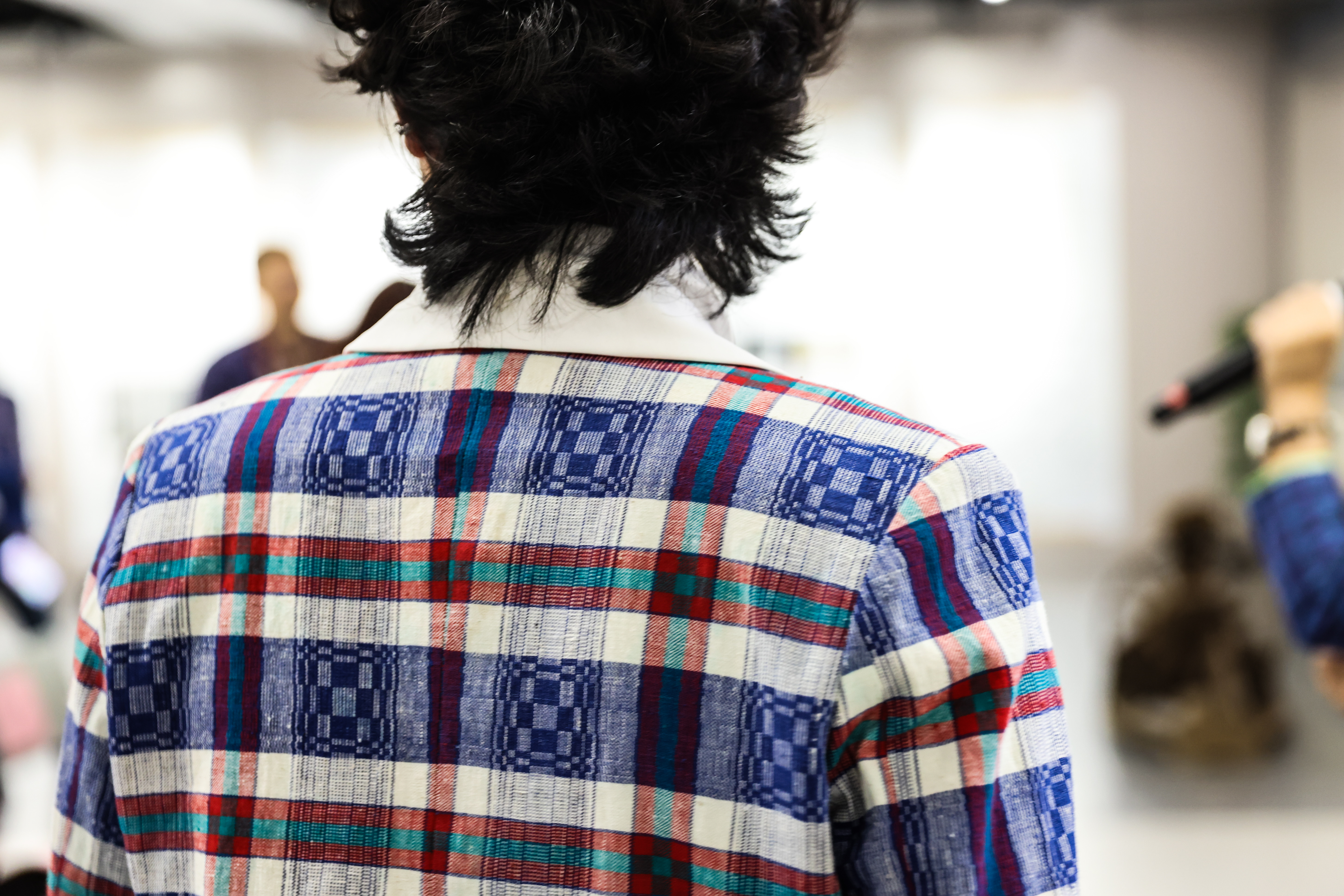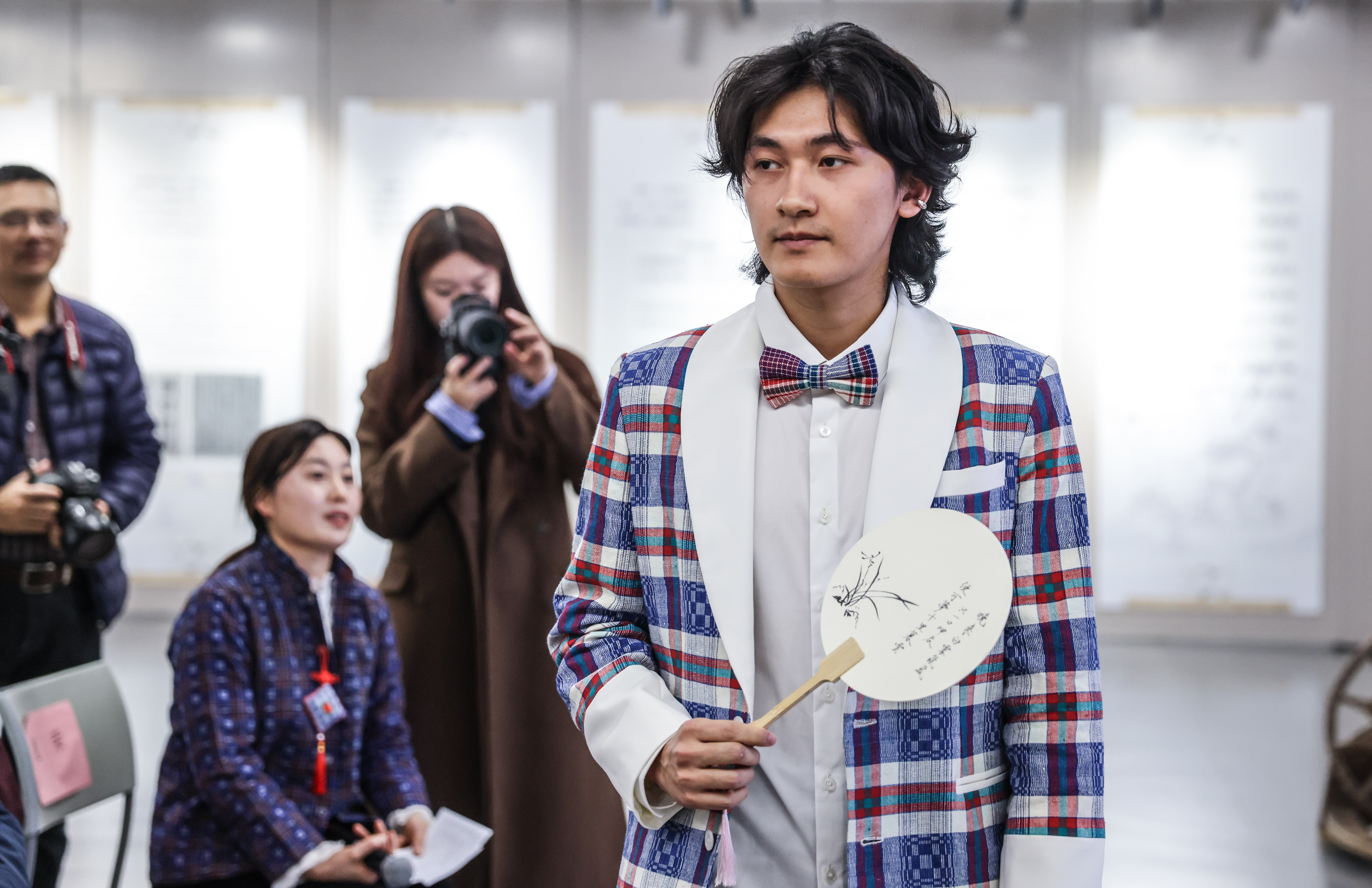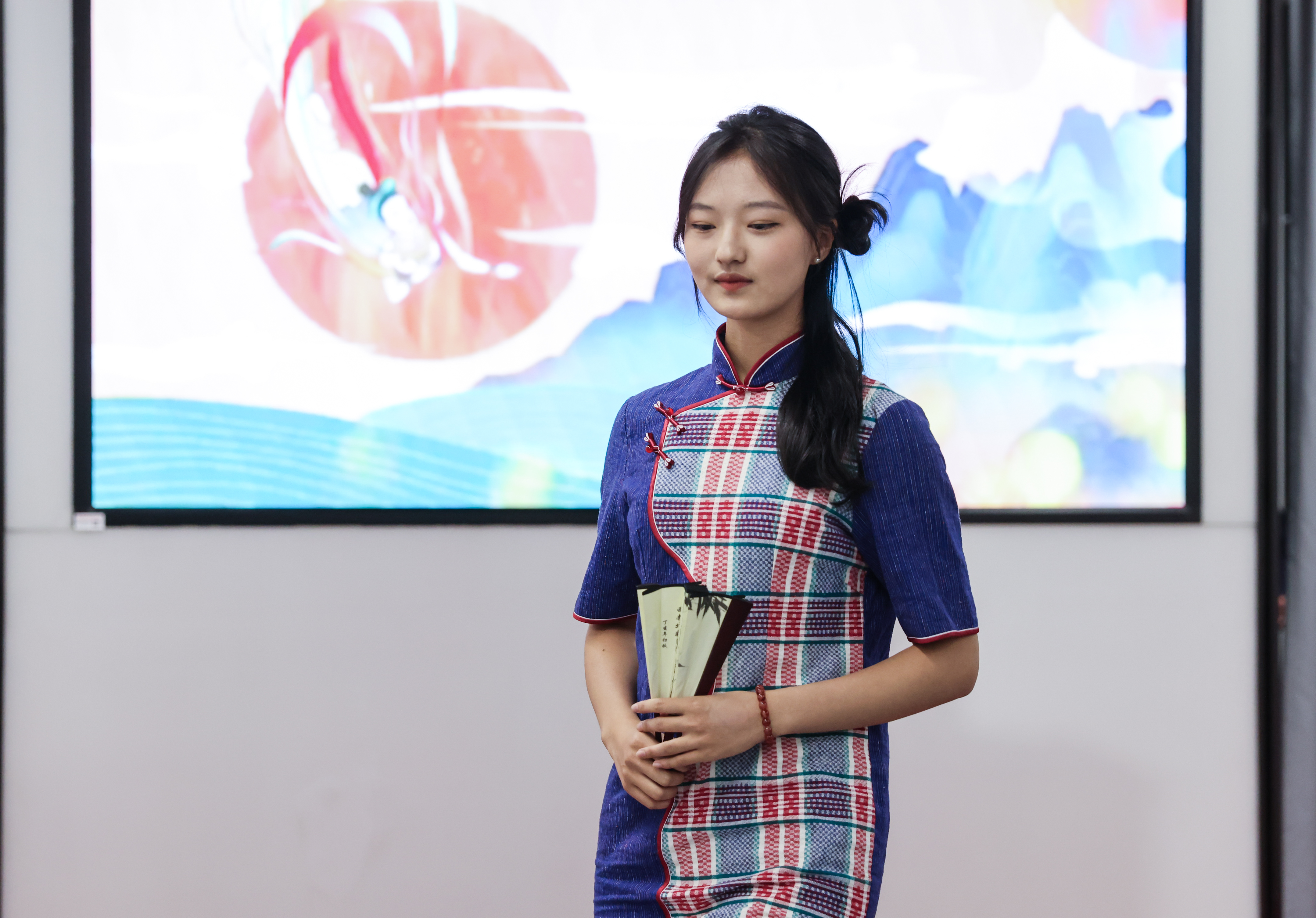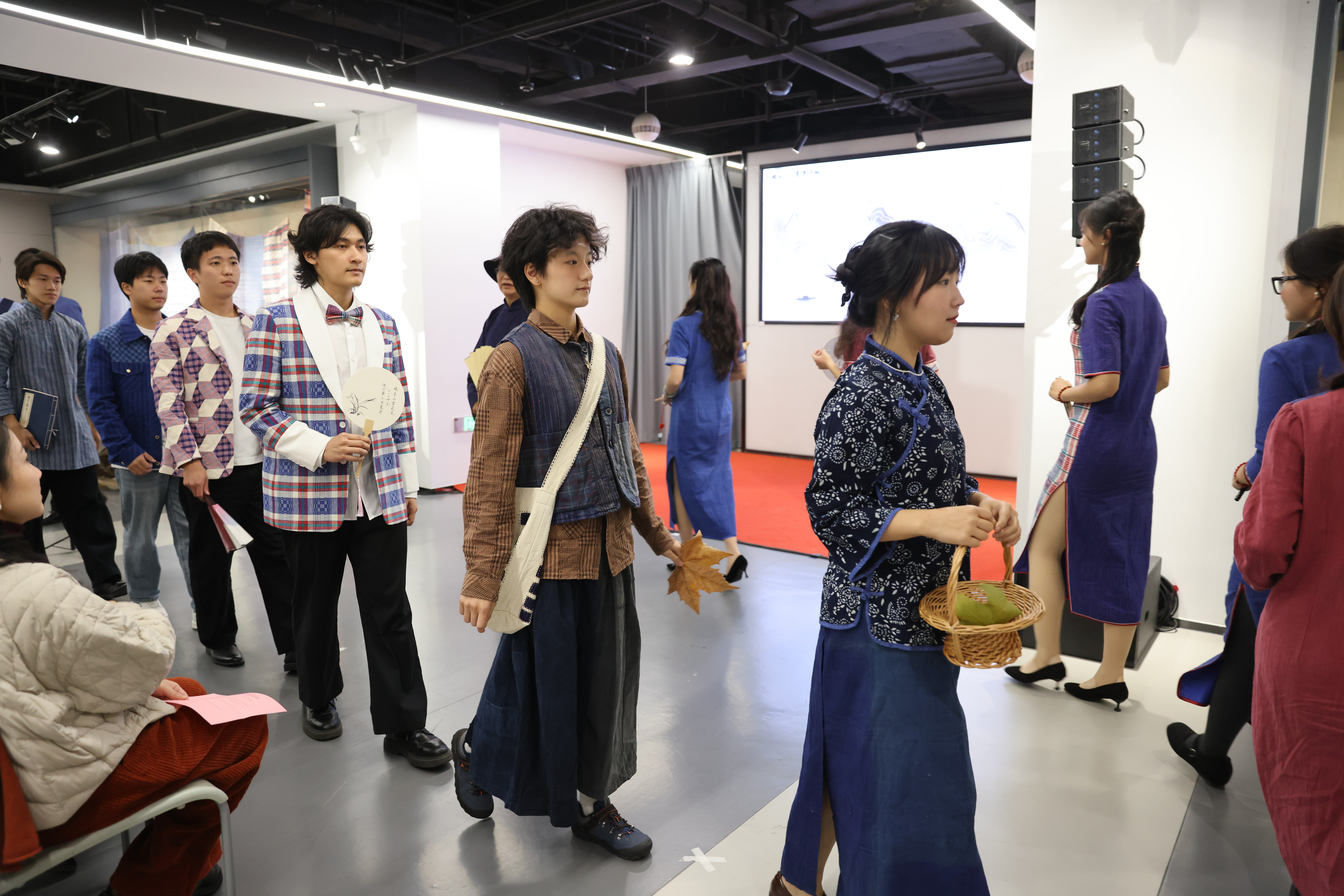 服饰秀环节,海峡两岸青年学生身着手工制作的土布服饰惊艳亮相,展示棉纺织技艺与现代时尚的完美交融。这些服饰的设计独具匠心,有的巧妙融入现代时尚元素,有的则原汁原味保留传统图案和工艺,每一件服饰都仿佛在静静诉说黄道婆精神在当代的传承与创新故事。传承人展示环节中,国家级非遗项目乌泥泾(黄道婆)手工棉纺织技艺徐汇区传承人林秀梅现场向观众进行讲解及操作展示,她熟练地操作三锭纺车,并与青年学生互动,让大家近距离、直观感受传统棉纺织工具的精妙绝伦。
