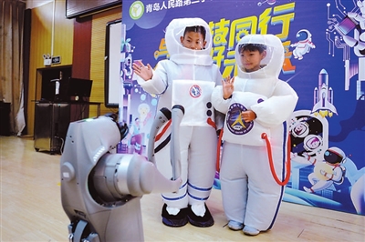 ②山东省青岛人民路第二小学两名身穿“宇航服”的学生与仿生机器狗互动。王海滨 摄