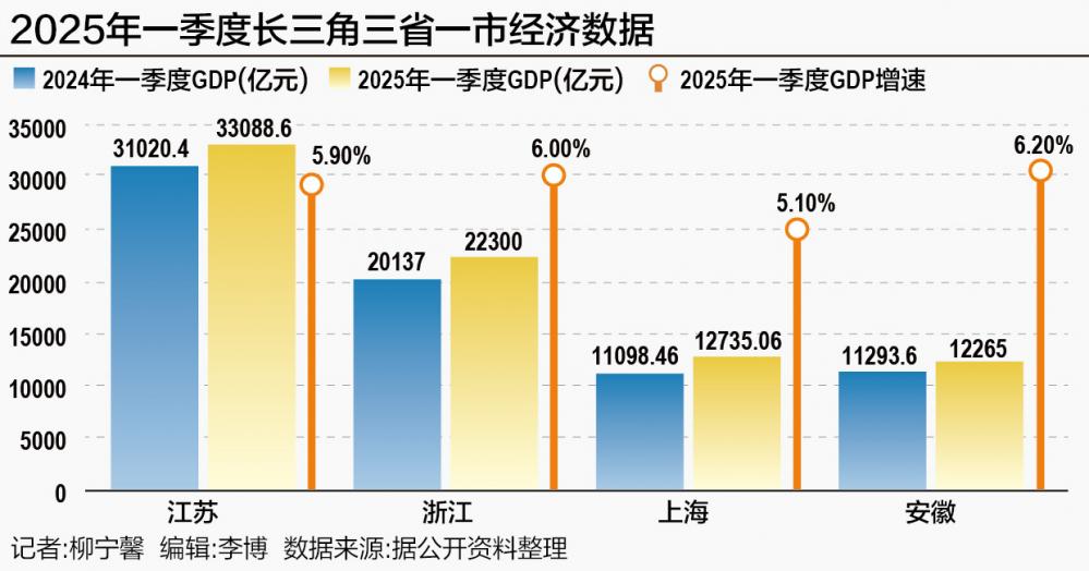 分省份看,一季度江苏实现地区生产总值33088.6亿元,同比增长5.9%;浙江GDP为22300亿元,同比增长6.0%;上海GDP达到12735.06亿元,同比增长5.1%;安徽GDP为12265亿元,同比增长6.2%。