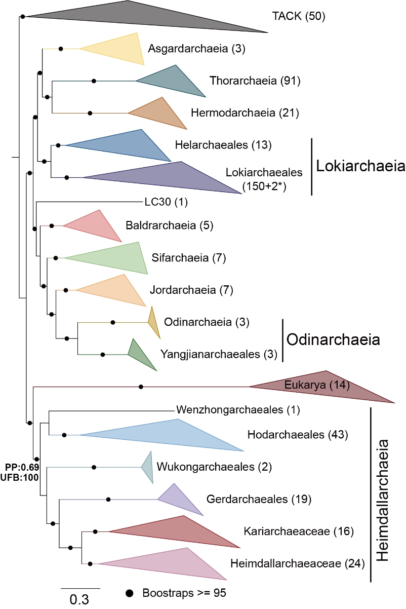 为使用串联67个标志蛋白构建的最大似然树,显示真核生物(Eukarya)与海姆达尔纲互为姐妹群系。