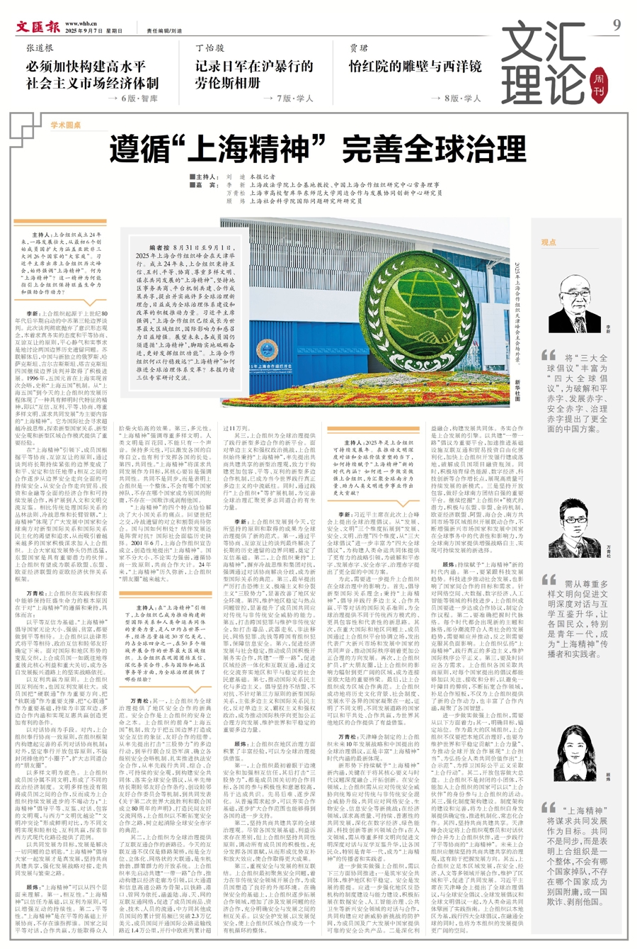 编者按 8月31日至9月1日,2025年上海合作组织峰会在天津举行。成立24年来,上合组织秉持互信、互利、平等、协商、尊重多样文明、谋求共同发展的“上海精神”,坚持地区事务共商、平台机制共建、合作成果共享,提出并实施许多全球治理新理念,日益成为全球治理体系建设和改革的积极推动力量。习近平主席强调,“上海合作组织已经成长为世界最大区域组织,国际影响力和感召力日益增强。展望未来,各成员国仍须遵循‘上海精神’,脚踏实地砥砺奋进,更好发挥组织功能”。上海合作组织何以行稳致远?“上海精神”如何推进全球治理体系变革?本报约请三位专家研讨交流。