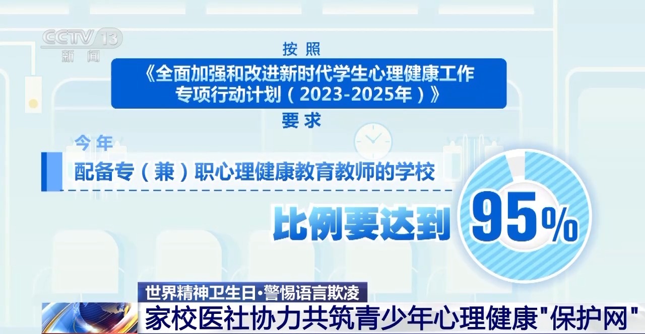 而学校作为青少年学习生活的另一重要场所,按照《全面加强和改进新时代学生心理健康工作专项行动计划(2023—2025年)》要求,今年,配备专(兼)职心理健康教育教师的学校比例要达到95%。专家指出,与之相对应的,也要加快提升心理教师的专业化水平。