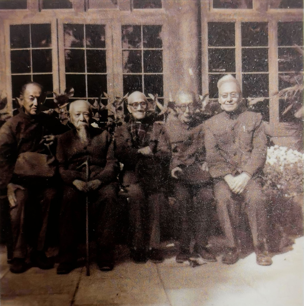 左起:潘雨廷、刘公纯、梁漱溟、王星贤、田镐1978年10月10日重阳节游北京香山卧佛寺留影