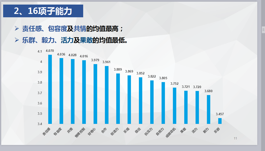 从《报告》的调研数据看,我国高校本科生的社会与情感能力整体处于中上水平。具体而言,大学生在责任感、包容度及共情三个维度的均值最高;而在乐群、毅力、活力及果敢四个维度的均值最低。