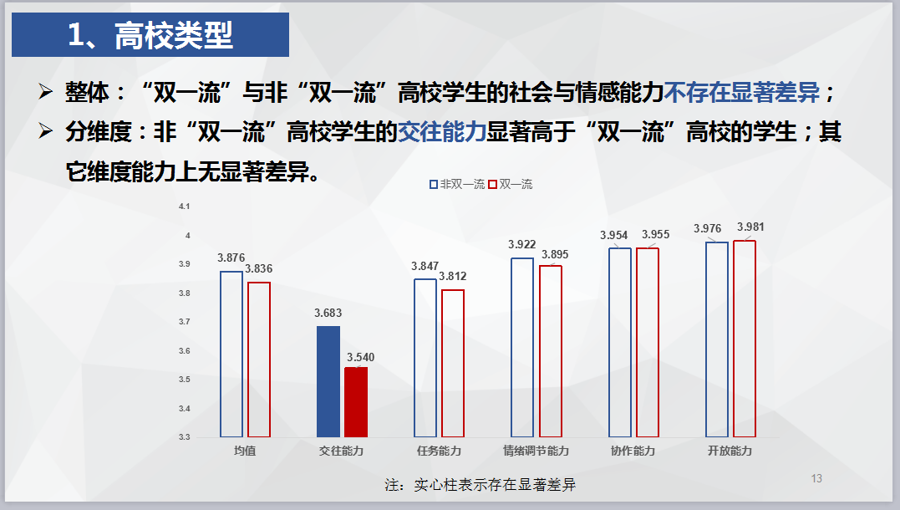 《报告》中有一组数据,引起了不少学者的关注与讨论。测评结果显示,无论是“双一流”高校还是非“双一流”高校学生,其社会与情感能力总体不存在显著差异。“拔尖生”与“非拔尖生”相比,也是如此。更令人意外的是,在“交往能力”这一分维度上,非“双一流”高校学生显著高于“双一流”高校学生。