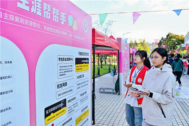华东师大生涯嘉年华主题活动月期间,闵行校区学生发展空间(光华书院)楼前还迎来了线下版生涯游园会。游园会围绕“生涯愿景、学职探索、目标落地、能力充电、行动促进”五大核心板块,搭建10个特色体验摊位,以趣味互动破解学子“不知兴趣所在”“不懂职业方向”“不会拆解目标”等常见困惑。