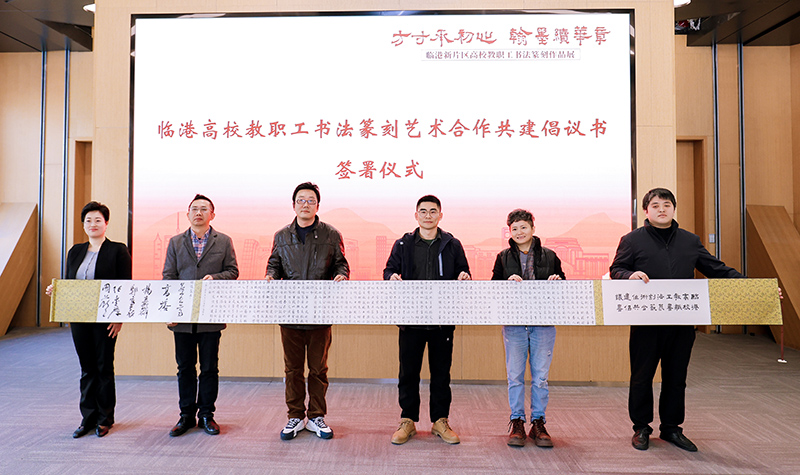 开幕式上,六校教职工艺术协会会长以传统毛笔签署《临港新片区高校教职工书法篆刻艺术合作交流共建倡议书》,标志着校际艺术交流迈向常态化、机制化。