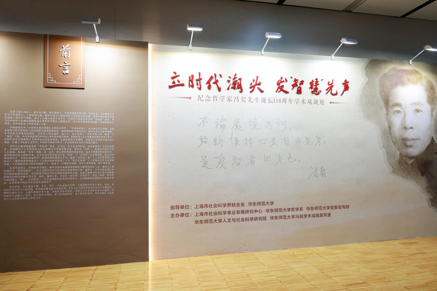 展览通过手稿、著作、照片、信札及相关实物,分五大板块立体呈现其求真、求善、求美的哲思历程、学术贡献与人格风范:“锲而不舍,实践悟道”以时间轴展现冯契的生平及成长历程;“博学而笃志”梳理冯契的师承和治学渊源;“转识而成智”介绍冯契的学术贡献,总结他在学科、学术、话语体系建设方面所取得的成就;“智慧传薪火”介绍冯契的育人之德和教学方法;“先生之风,山高水长”介绍冯契持续而深远的影响。