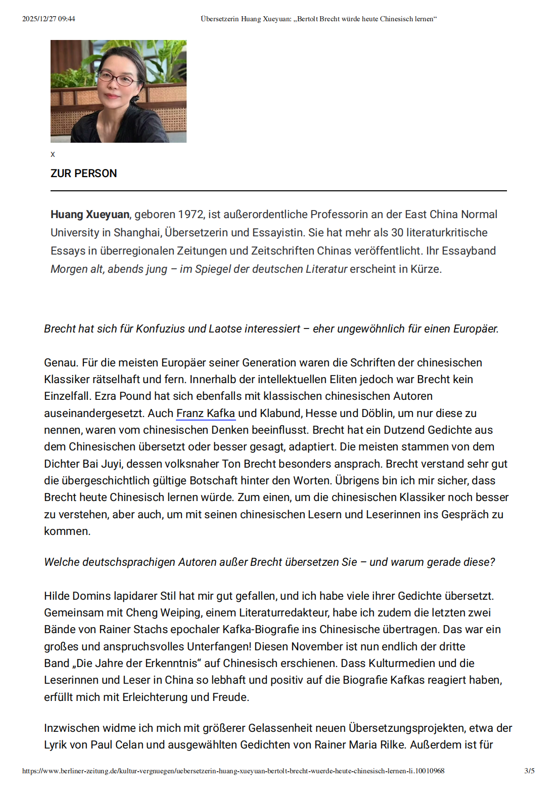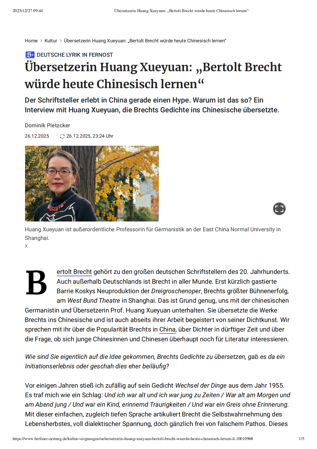 导读:近日,《柏林日报》文学版刊登了对中国日耳曼学学者兼译者,华东师大德语系副教授黄雪媛老师的访谈。访谈围绕黄雪媛老师对德国著名剧作家和诗人贝托尔特·布莱希特(Bertolt Brecht)的译介和传播,也谈及德语文学翻译和文学教学。她翻译的布莱希特诗集在中国受到广泛关注和喜爱,引发了中国读者对这位叙事剧大师的诗歌作品的热潮,访谈也探讨了文学在数字时代的地位和影响力。