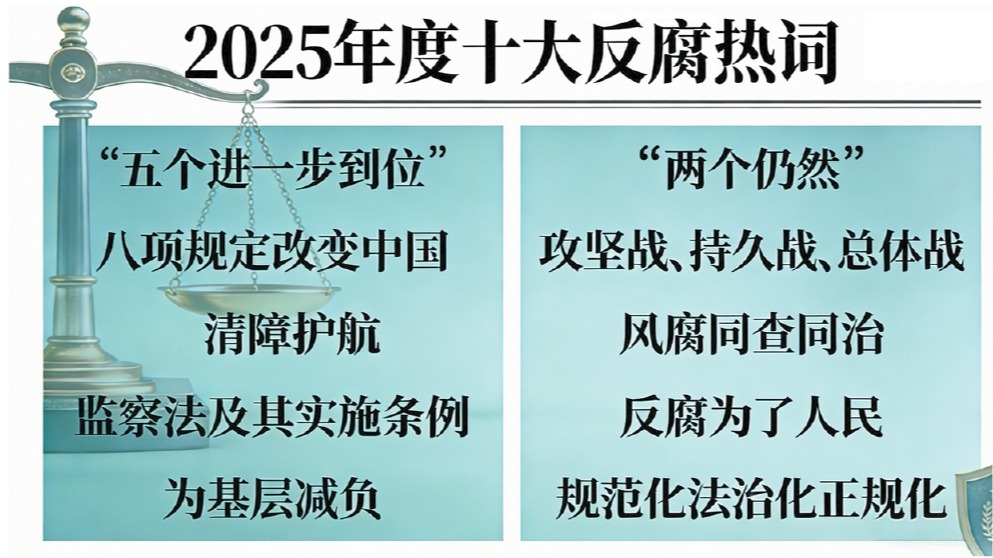 日前,中央纪委国家监委网站依照惯例公布了2025年度十大反腐热词。这是自2018年以来第八次发布年度十大反腐热词。反腐热词聚焦全面从严治党、党风廉政建设和反腐败斗争理论与实践,总结了过去一年纪检监察工作的新进展,展示了深刻把握反腐败斗争规律的新认识,反映了新时代廉洁文化建设的新成果。资料图片集中体现纪检监察工作的新进展 这十大反腐热词分布在习近平总书记重要讲话、党中央的工作部署、二十届中央纪委四...