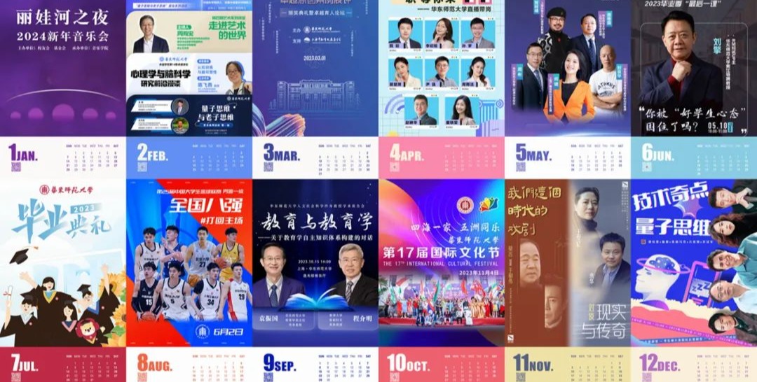 元旦快乐!2024年第一天,华东师大月历上新,回顾一起“播”种的美好! 我们以数智之名,在云端相约,直播美好,实现知识共享、机遇共享、欢乐共享、记忆共享。过去一年,华东师大各社交平台直播逾120场,年度累计观看人次9200000余次,让华东师大映像飞入千家万户。回顾过往,以启新篇,从2023年重点直播活动中遴选设计的2024华东师大月历上新啦!一月 在全新揭幕的大零号湾文化艺术中心,共叙情谊,共迎新年,在温...