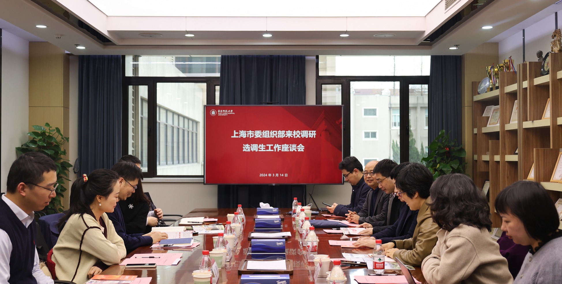 为调研评估政策执行,密切供需对接,更好地推进选调生工作,3月14日上午,上海市委组织部干部规划办主任顾永波、公务员二处处长沈文等一行来华东师大就选调生工作进行专项调研。校党委副书记、副校长顾红亮,校学生工作委员会副主任、校党委原副书记杨昌利,党委学生(研究生)工作部、校党委组织部、选调生工作办公室、政治与国际关系学院、教育学部等单位负责人参会。党委学生(研究生)工作部部长、选调生工作办公室主任...