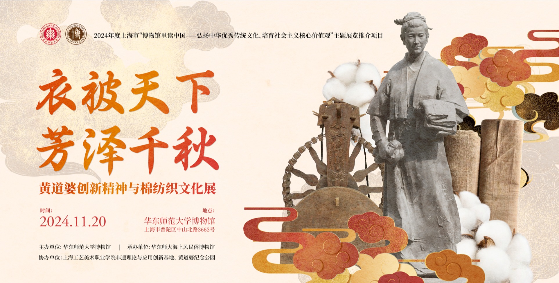 近日,上海市文物局开展了2024年度上海市“博物馆里读中国——弘扬中华优秀传统文化、培育社会主义核心价值观”主题展览项目评选和推介活动。经专家组评议等,华东师大博物馆申报的“衣被天下 芳泽千秋——黄道婆创新精神与棉纺织文化展”获评2024年度上海市“博物馆里读中国——弘扬中华优秀传统文化、培育社会主义核心价值观”主题展览项目,全市仅有12个展览项目获评,高校博物馆只有2个项目获评。 在“5.18国际博物...